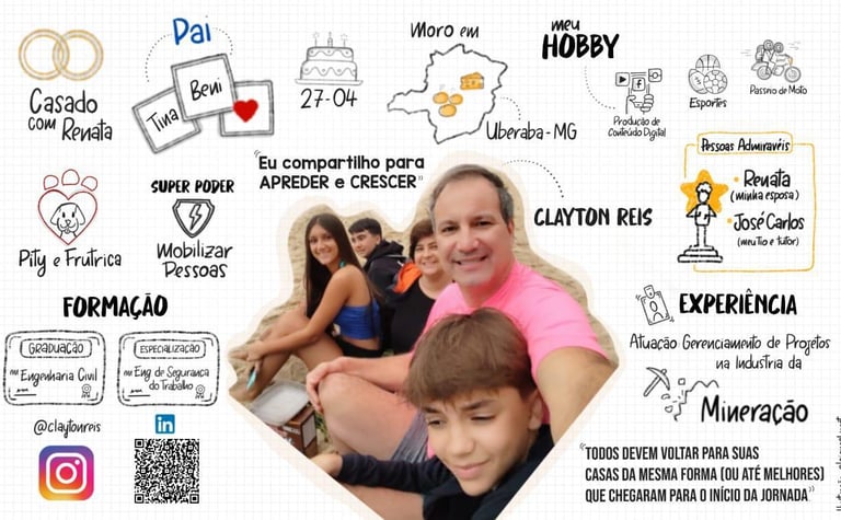 Sou Clayton Reis, casado, pai de um casal de pré-adolescentes, tutor de duas cadelas e, junto com minha esposa, empreendedor no mercado fitness. O valor "família" sempre foi a base da minha jornada de mais de 25 anos atuando em grandes projetos de capital nas áreas de telecom, energia e mineração por todo o Brasil.